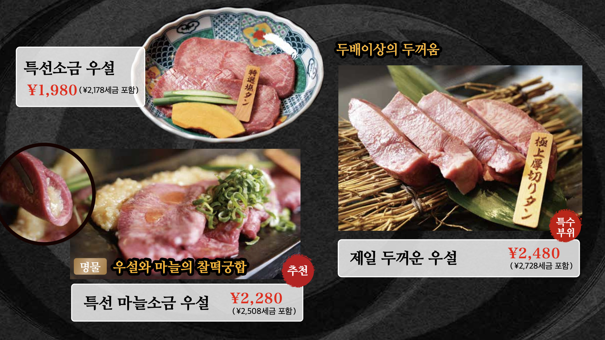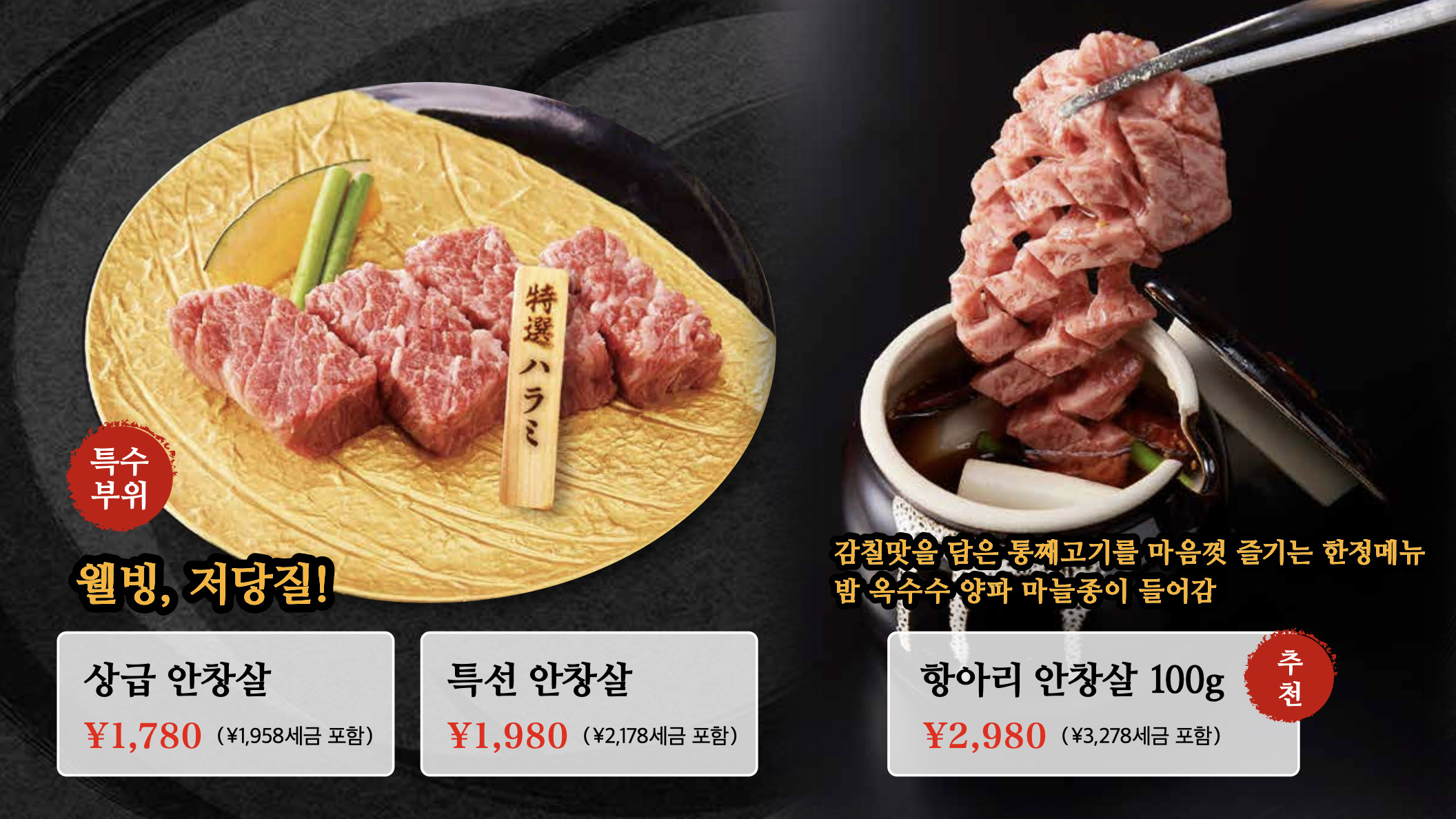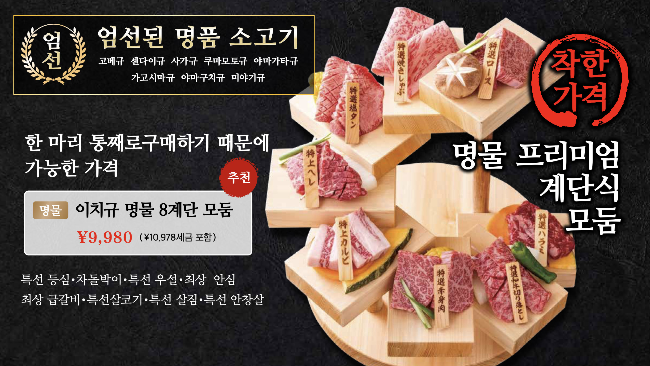 특선 우설과 특선 샤토브리앙을 메인으로 한 가성비 좋은 메뉴로, 푸짐하고 만족스러운 식사를 즐기실 수 있습니다. 고급 와규를 가볍게 즐길 수 있어 일상의 소소한 보상이나 친한 사람들과의 식사로 추천해 드립니다.